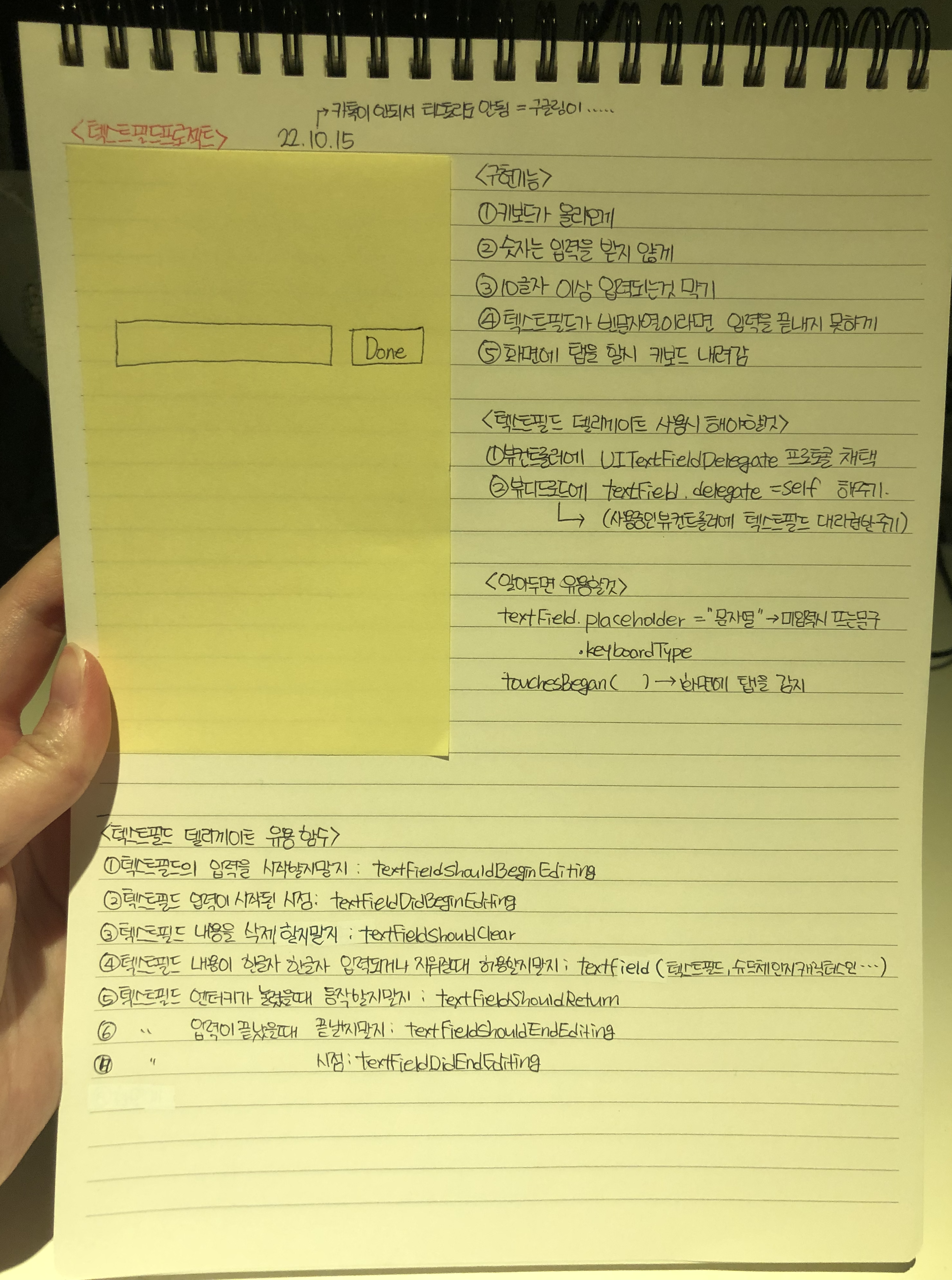1. 텍스트필드 델리게이트 관련 함수를 쓸땐 꼭 ui텍스트필드델리게이트 프로토콜 채택하기, 델리게이트 권환 설정해주기
