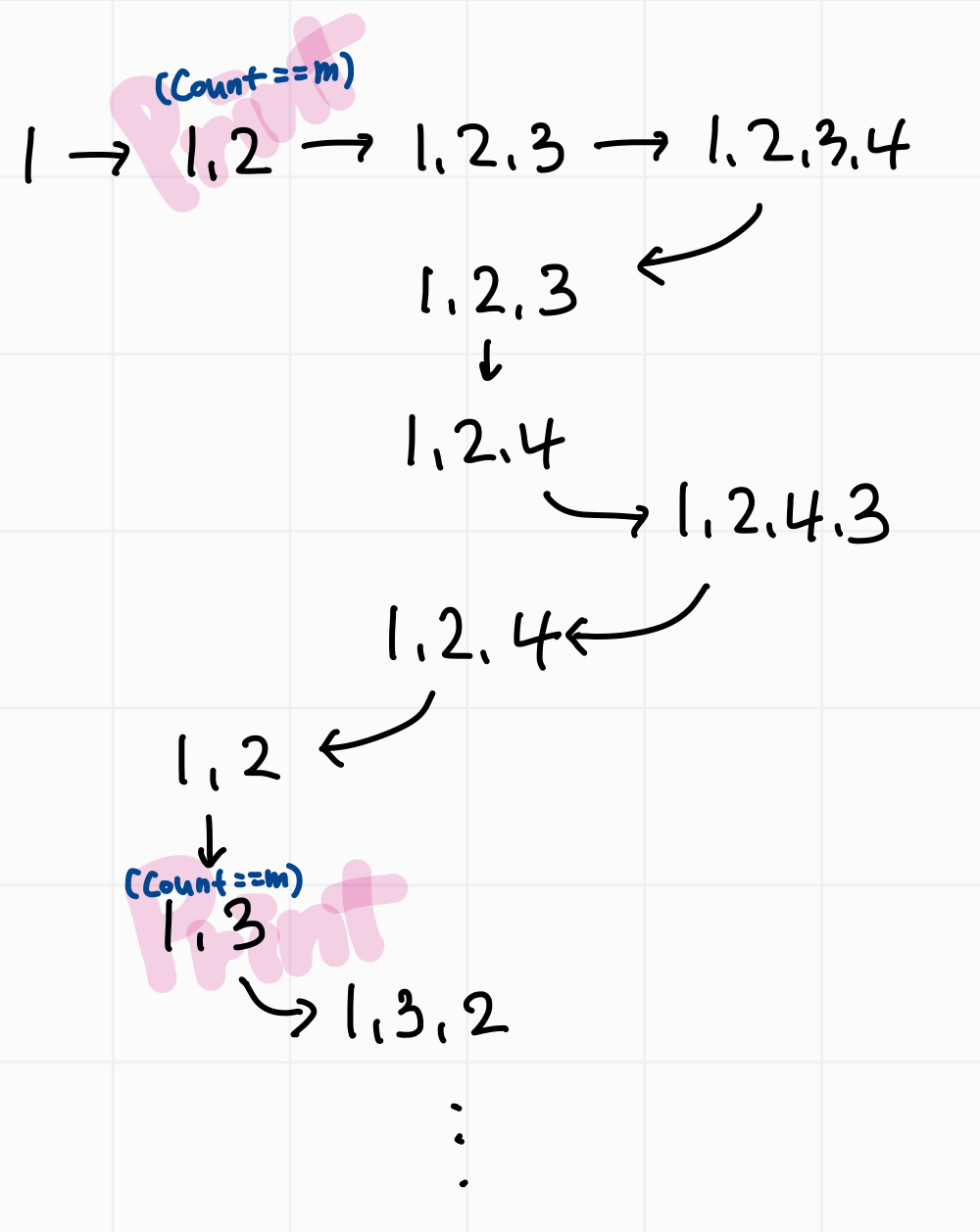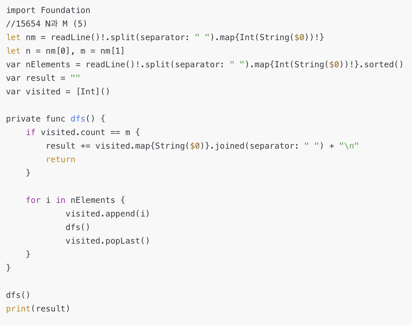 만약 for문에 if문처럼 필터가 들어가지 않는다면 visited.count == m부분에서 마지막에 return을 걸어야 무한루프가 돌지 않는다.